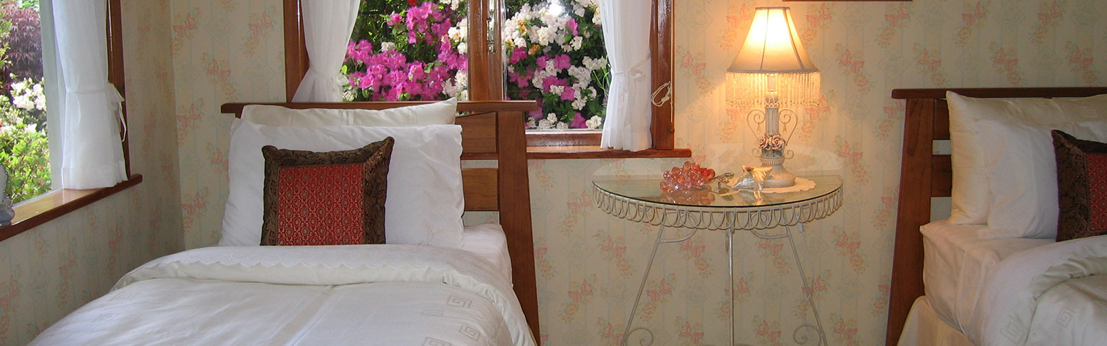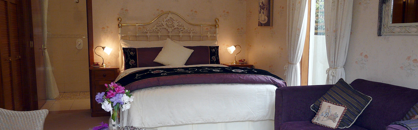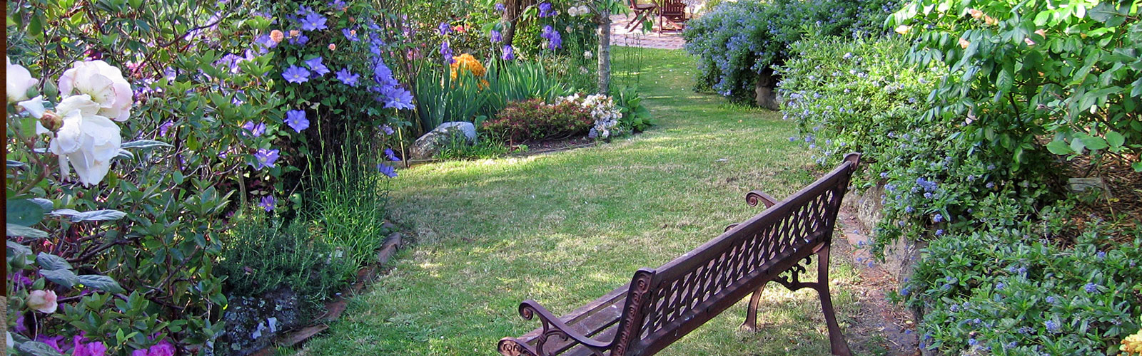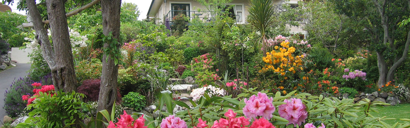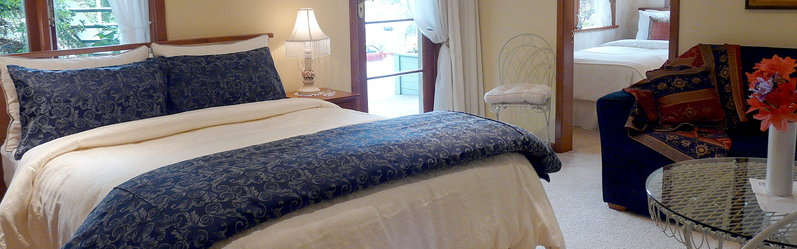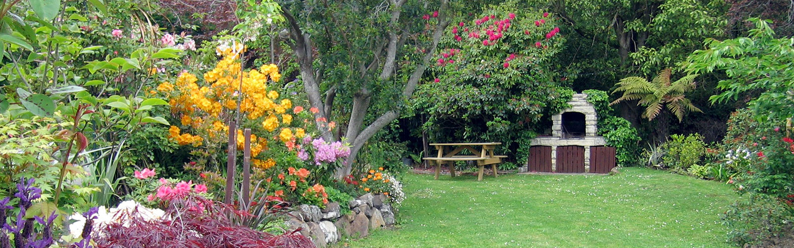 Surrounded by many mature trees, native plants, roses and rhododendrons, these beautiful gardens are filled with colour, fragrance & birdsong. Relax in your luxuriously furnished suite with private garden entrance and ensuite bathroom, stroll the winding pathways, find a hidden seat, enjoy a glass of wine in the gazebo, read a book under the pergola, gaze at the stars in the jacuzzi hot tub, unwind in the sauna house, or simply cosy up in front of the stone fire place at the bottom of the garden.